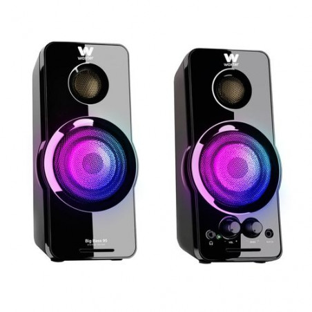 Woxter Big Bass 95 RGB es un elegante y potente sistema de altavoces 2.0 con el que podrás sacar el máximo partido a tus contenidos multimedia, como juegos, música y películas. Este sistema de sonido ofrece una calidad excepcional y dispone de conector para auriculares y control de volumen y graves en la parte frontal. Big Bass 95 cuenta con un diseño compacto y estilizado, con acabado en negro piano, y permite conectar dispositivos multimedia, como reproductores MP3/MP4, tablets y portátiles.Altavoces multimedia 2.0 de último diseño con terminación Negro PianoCon una potencia de sonido de 20 W y una reproducción de graves dinámica, estos altavoces son perfectos para reproducir música, juegos, películas y vídeos online tanto en MAC como en PC. Ofrecen un rendimiento máximo para toda tu música digital.Los Big Bass 95 son compactos y estilizados, con un acabado en negro piano, combinan una avanzada ingeniería con un aspecto impecable para proporcionar un sonido espectacular con tu ordenador de sobremesa, portátil o con su reproductor de MP3 gracias a su entrada auxiliar para dispositivos de audio.Los controles independientes en el panel frontal para el volumen y los bajos facilitan la reproducción de todo tipo de música, además incluyen una conexión para auriculares.Características de los altavoces 2.0 Woxter Big Bass 95 RGB -Altavoces multimedia de último diseño con terminación Negro Piano. -Luces Led con control táctil en la parte superior. -Potencia: 20 W -Botones para control de volumen, graves y agudos en la parte frontal. -Indicador luminoso de estado -Unidad rango completo de 3\'\'. -Incorpora clavija para auriculares en la parte frontal. Cómodo y versátil. -Entrada auxiliar frontal para su dispositivo de audio: MP3, etc... -Fácil conexión a su PC, portátil, etc... a través del mini-jack de 3.5mm. -Frecuencia de respuesta: 50Hz-20Khz. -Separación > 35 dB. S/N Ratio > 70 dB. -Dimensiones: 98x97x207mm.