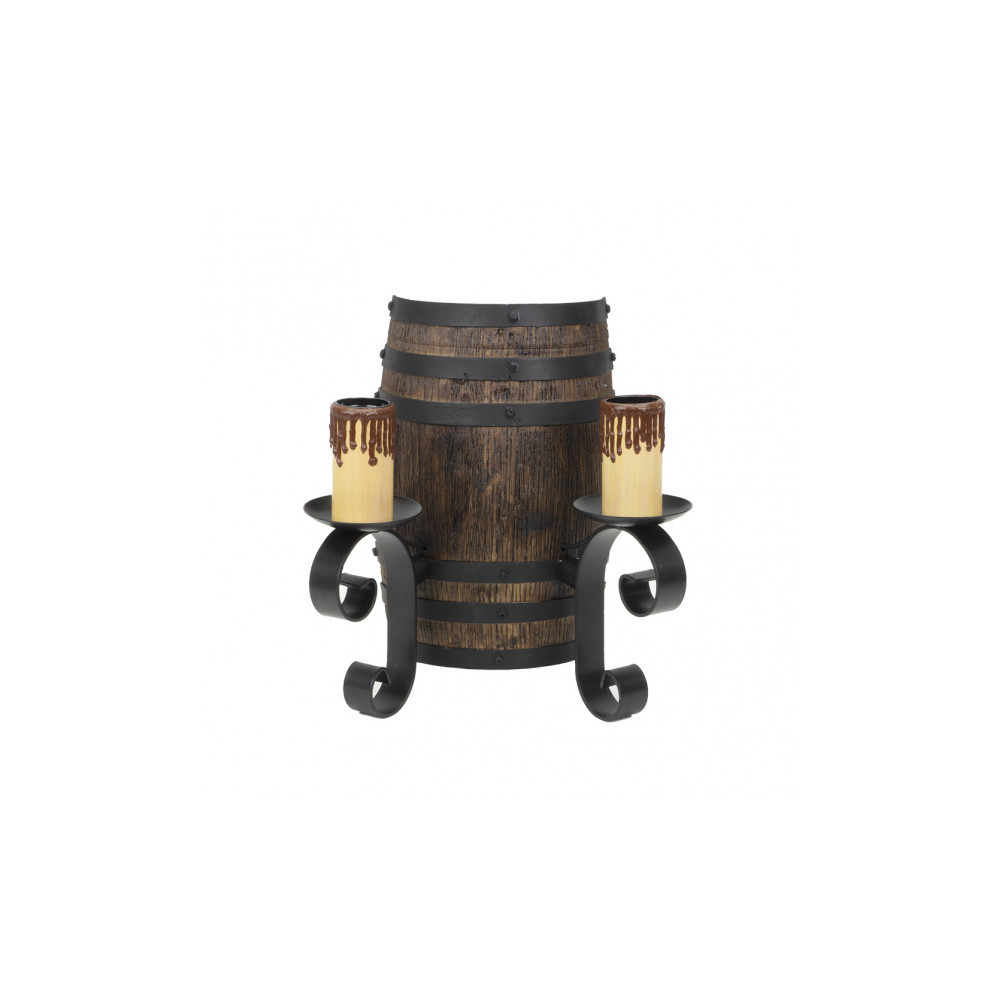 Aplique de dos luces de la serie BARRIL de color NEGRO/MARRON realizado en resina y metal, con fundas portavelas de policarbonato. Destaca por su estilo rústico, imitando a barriles, ideales para casas de campo, bodegones y salones de celebración. Tiene dos portalámparas E27. Bombillas no incluidas. Se recomienda el uso de bombillas en forma de vela para preservar su estética. Tiene unas dimensiones de 29x27x16 centímetros. En esta serie podemos encontrar la lámpara de cuatro y seis luces y los apliques de una y dos luces para conseguir su composición ideal.