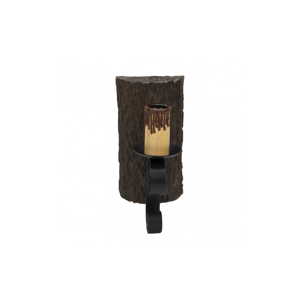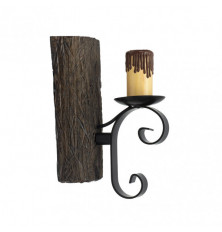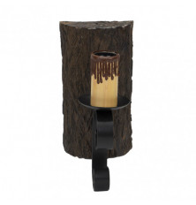 Aplique de una luz de la serie TRONCO de color NEGRO/MARRON. Realizado en metal y resina con cubre velas de policarbonato. Responde a un estilo rústico, ideal para casas de campo, bodegones y restaurantes, simulando que el aplique sale directamente de un tronco de madera. Utiliza un portalámparas E27. Bombilla no incluida. Es aconsejable completar con bombillas en forma de vela para preservar su estética. Sus dimensiones son de 25x12x17 centímetros. Este aplique forma parte de una familia compuesta por una lámpara de 4 y 6 luces, además de los apliques de una y dos luces.