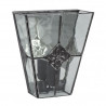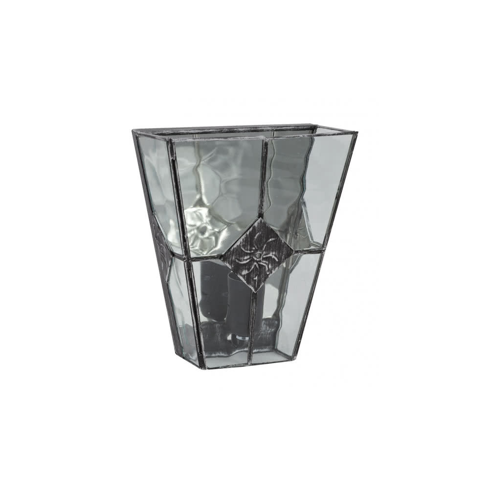 Aplique de la serie ESTEPA fabricado en metal color plata envejecida y cristal rugoso. Tiene unas dimensiones de 25x20x12 centímetros y un peso neto de 1030 gramos. Posee un porta lámparas E27, bombilla no incluida. En esta serie podemos encontrar el colgante, el aplique y dos tamaños de plafones, todos en color plata, oro y cobre.