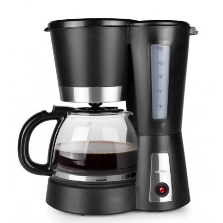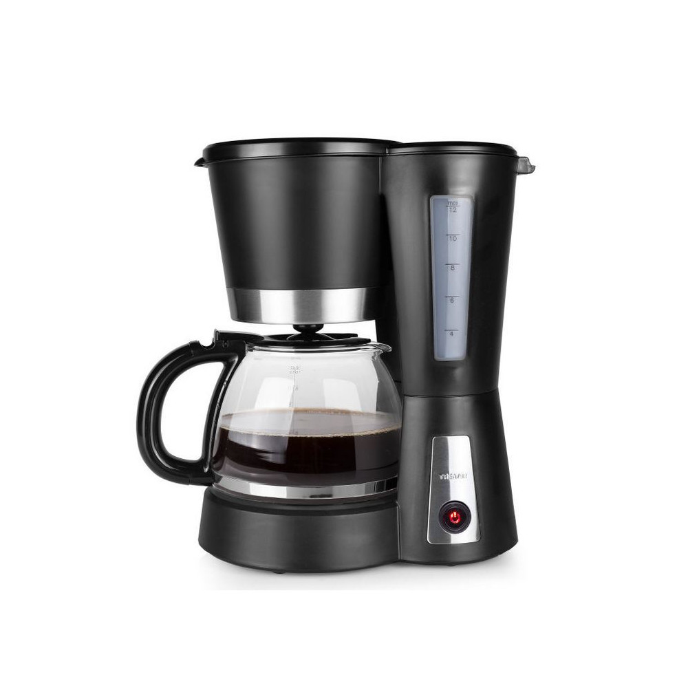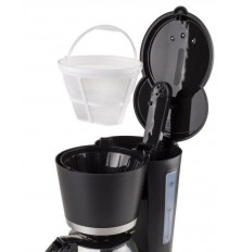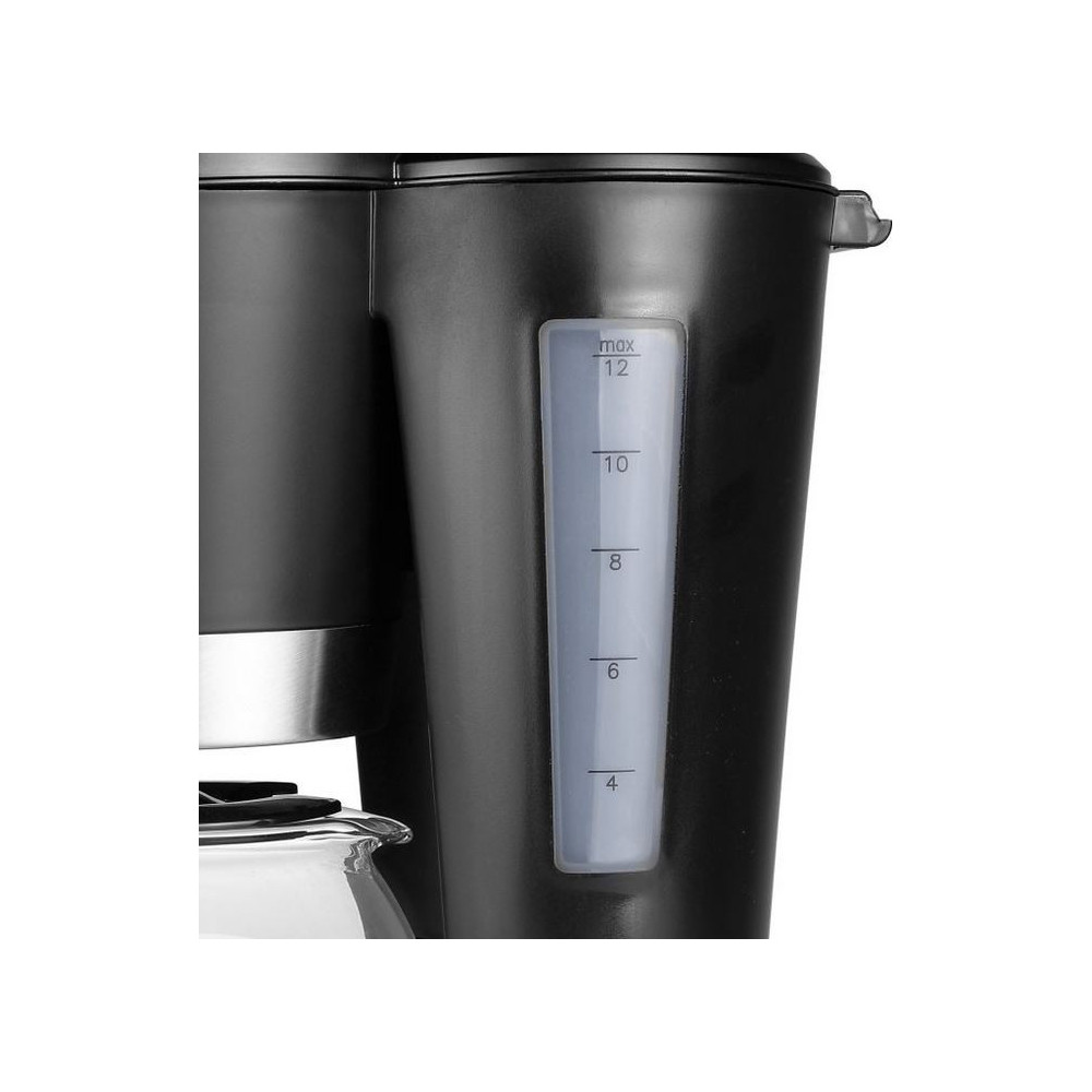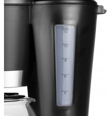 Bonita y elegante cafetera. Adecuada para 10 a 12 tazas de café (1,2 L). Acabado en negro mate y acero inoxidable. Equipada con un sistema anti-goteo, función para mantener la temperatura y tanque de agua transparente. - Capacidad: 1,2 L; - Adecuada para 10-12 tazas; - Interruptor de encendido/apagado con indicador luminoso; - Sistema anti goteo; - Jarra de vidrio; - Función para mantener caliente; - Indicador de nivel de agua; - Apagado automático 40 minutos; - Indicador de contenido máximo; - Filtro extraíble; - Jarra extraíble; - Pies anti-deslizantes; - Potencia: 900 Vatios.