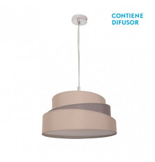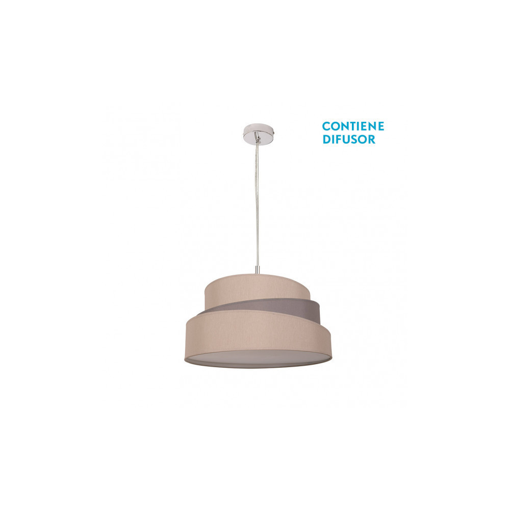 Colgante de la serie COLONIA en color GRIS/TOPO de 40 centímetros de diámetro. Realizado en metal y textil. Destaca por su diseño original y moderno, con su pantalla combinando colores y texturas y con sus formas inclinadas. Utiliza tres portalámparas E27. Bombillas no incluidas. Tiene unas dimensiones, regulables en altura, de 30<,85x40x40 centímetros. En esta serie podemos encontrar el colgante de 40 cm y 50 cm de diámetro y el pie de salón a juego, todos en plata/blanco o en gris/topo.