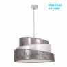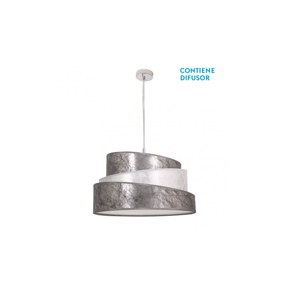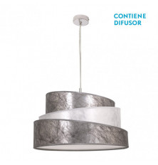 Colgante de la serie COLONIA en color PLATA/BLANCO de 50 centímetros de diámetro. Realizado en metal y textil. Destaca por su diseño original y moderno, con su pantalla combinando colores y texturas y con sus formas inclinadas. Utiliza tres portalámparas E27. Bombillas no incluidas. Tiene unas dimensiones, regulables en altura, de 30<,85x50x50 centímetros. En esta serie podemos encontrar el colgante de 40 cm y 50 cm de diámetro y el pie de salón a juego, todos en plata/blanco o en gris/topo.