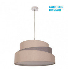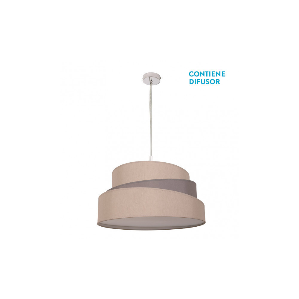 Colgante de la serie COLONIA en color GRIS/TOPO de 50 centímetros de diámetro. Realizado en metal y textil. Destaca por su diseño original y moderno, con su pantalla combinando colores y texturas y con sus formas inclinadas. Utiliza tres portalámparas E27. Bombillas no incluidas. Tiene unas dimensiones, regulables en altura, de 30<,85x50x50 centímetros. En esta serie podemos encontrar el colgante de 40 cm y 50 cm de diámetro y el pie de salón a juego, todos en plata/blanco o en gris/topo.