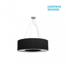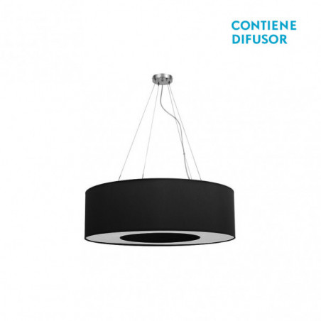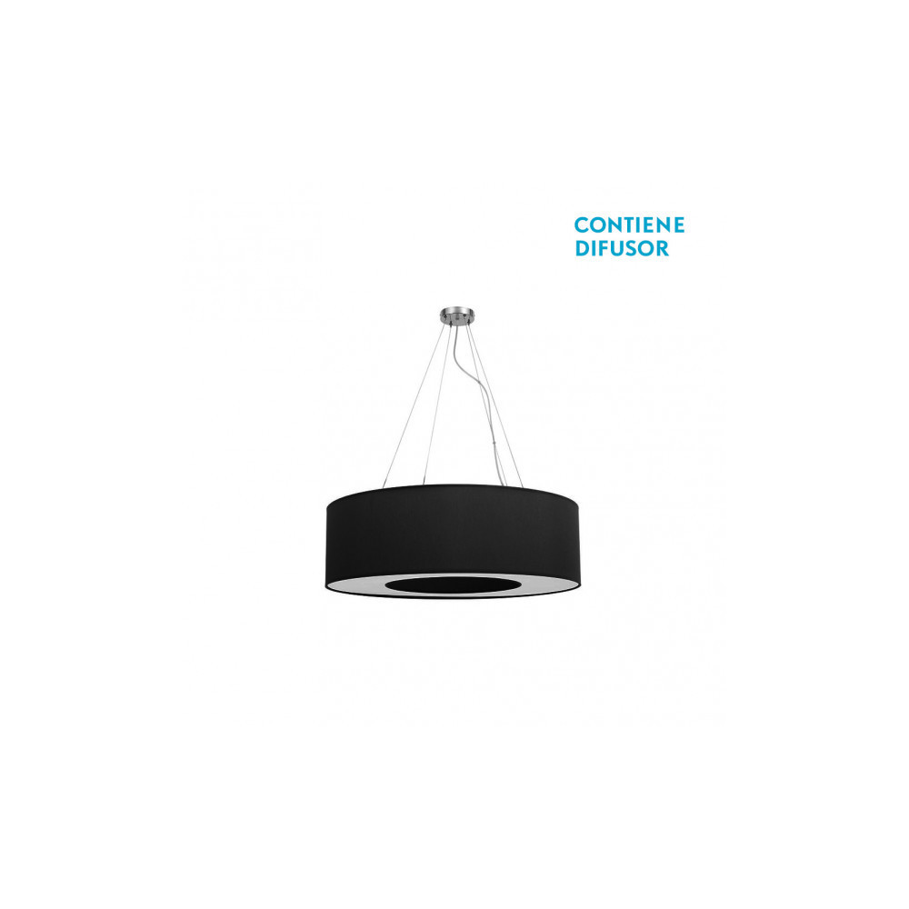 Colgante de techo pequeño de la serie HAITI en color CROMO/NEGRO. Realizado en textil y metal. Destaca por su diseño moderno de pantalla cilíndrica con hueco central, como si fuera un gran anillo, viene acoplado también con su difusor. Ideal para decorar en salones, dormitorios y zonas de trabajo, haciéndose el centro de la habitación que ilumina. Posee cuatro portalámparas E27. Bombillas no incluidas. Tiene unas dimensiones, regulables en altura, de 40<,120x50x50 centímetros. En esta serie podemos encontrar a juego los colgantes de 50, 65 y 80 centímetros de diámetro y los sobremesas, todos en color negro, marrón, piedra, topo, madera gris y madera clara combinados con cromo para adaptar el que mejor quede con su decoración.