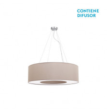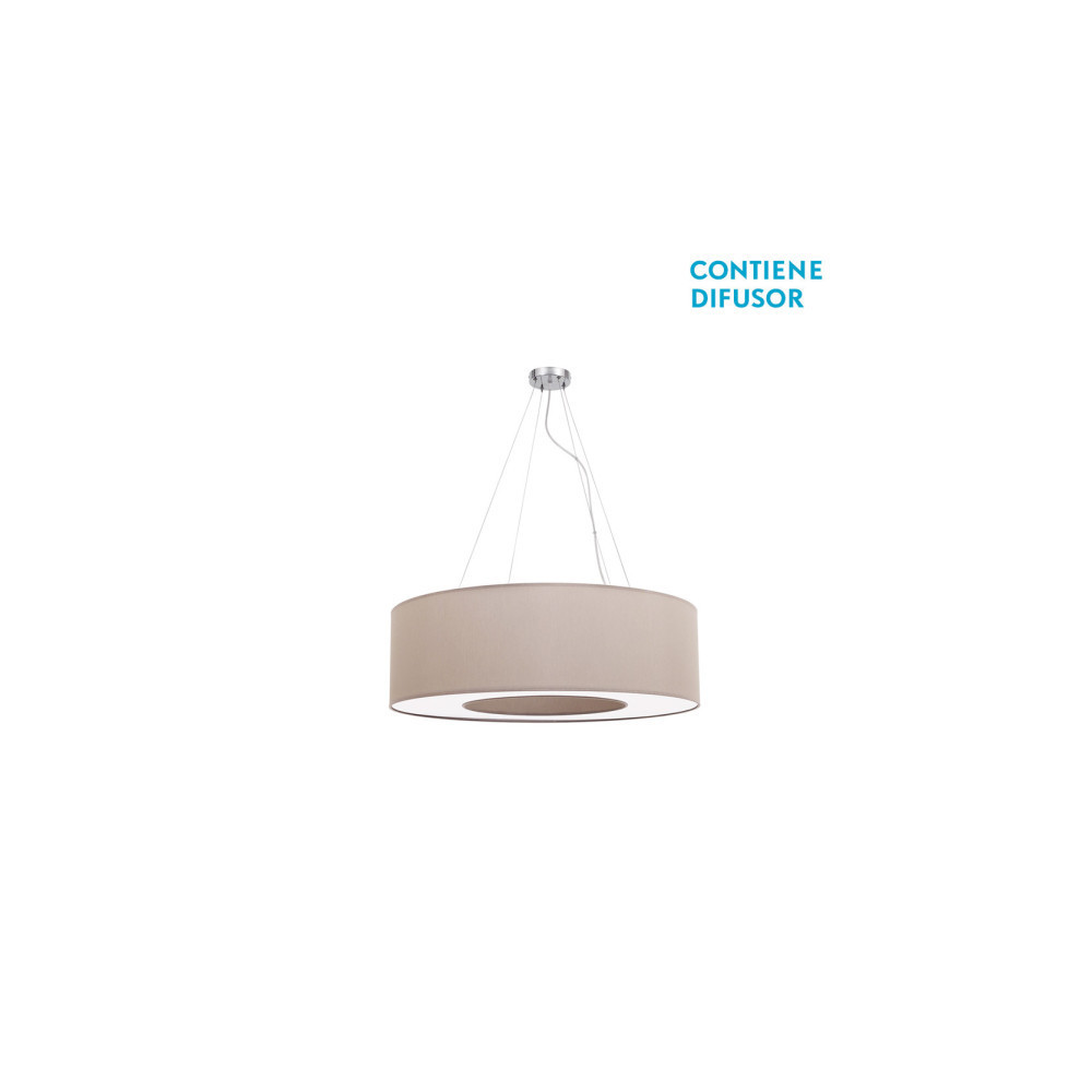 Colgante de techo pequeño de la serie HAITI en color CROMO/PIEDRA. Realizado en textil y metal. Destaca por su diseño moderno de pantalla cilíndrica con hueco central, como si fuera un gran anillo, viene acoplado también con su difusor. Ideal para decorar en salones, dormitorios y zonas de trabajo, haciéndose el centro de la habitación que ilumina. Posee cuatro portalámparas E27. Bombillas no incluidas. Tiene unas dimensiones, regulables en altura, de 40<,120x50x50 centímetros. En esta serie podemos encontrar a juego los colgantes de 50, 65 y 80 centímetros de diámetro y los sobremesas, todos en color negro, marrón, piedra, topo, madera gris y madera clara combinados con cromo para adaptar el que mejor quede con su decoración.