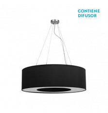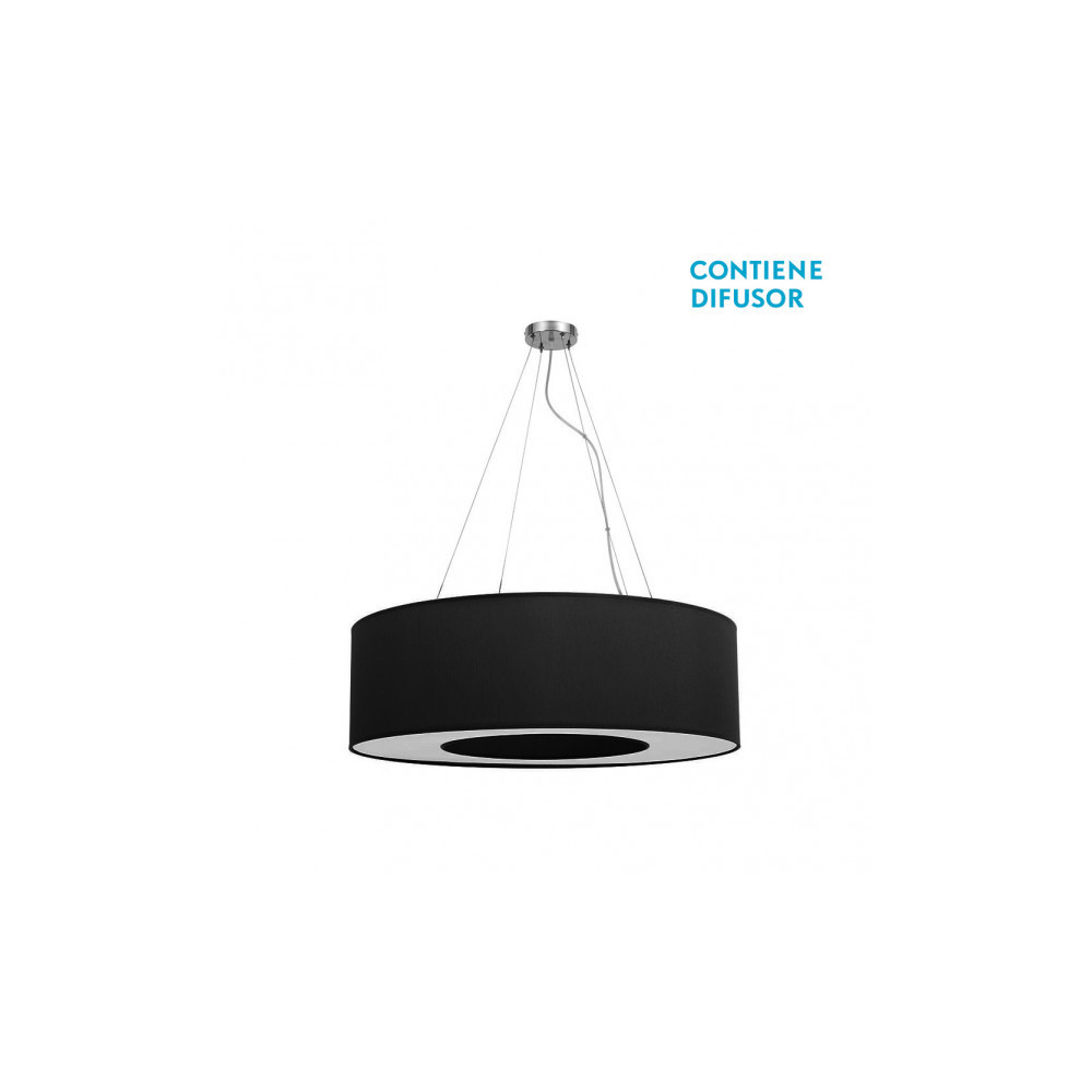 Colgante de techo mediano de la serie HAITI en color CROMO/NEGRO. Realizado en textil y metal. Destaca por su diseño moderno de pantalla cilíndrica con hueco central, como si fuera un gran anillo, viene acoplado también con su difusor. Ideal para decorar en salones y comedores, haciéndose el centro de la habitación que ilumina. Posee cuatro portalámparas E27. Bombillas no incluidas. Tiene unas dimensiones, regulables en altura, de 40<,120x65x65 centímetros. En esta serie podemos encontrar a juego los colgantes de 50, 65 y 80 centímetros de diámetro y los sobremesas, todos en color negro, marrón, piedra, topo, madera gris y madera clara combinados con cromo para adaptar el que mejor quede con su decoración.