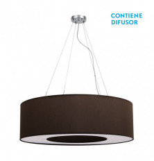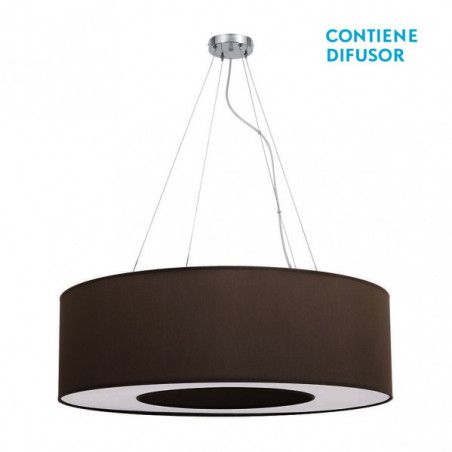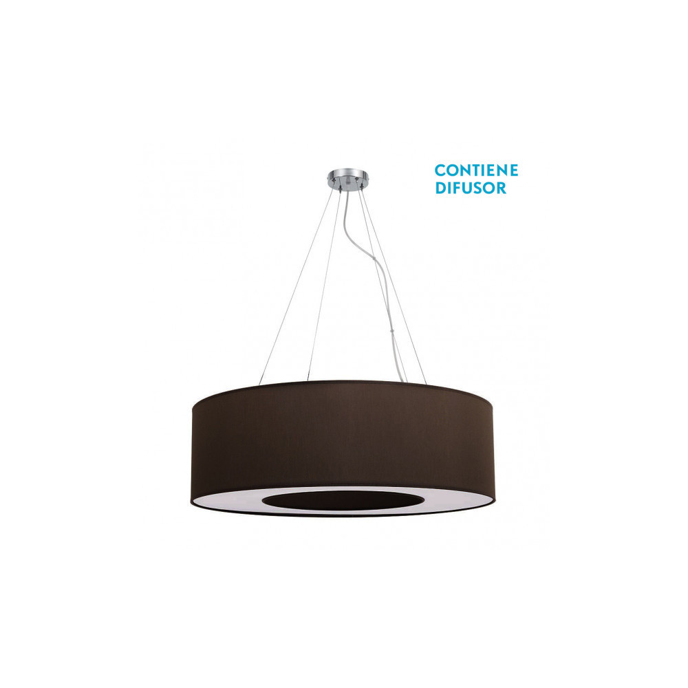 Colgante de techo de la serie HAITI en color CROMO/MARRON. Realizado en textil y metal. Destaca por su diseño moderno de pantalla cilíndrica con hueco central, como si fuera un gran anillo, viene acoplado también con su difusor. Ideal para decorar en salones y comedores de gran tamaño, haciéndose el centro de la habitación que ilumina. Posee cuatro portalámparas E27. Bombillas no incluidas. Tiene unas dimensiones, regulables en altura, de 40<,120x80x80 centímetros. En esta serie podemos encontrar a juego los colgantes de 50, 65 y 80 centímetros de diámetro y los sobremesas, todos en color negro, marrón, piedra, topo, madera gris y madera clara combinados con cromo para adaptar el que mejor quede con su decoración.
