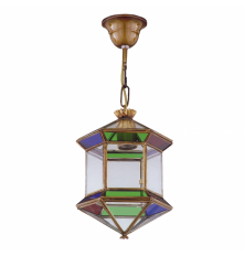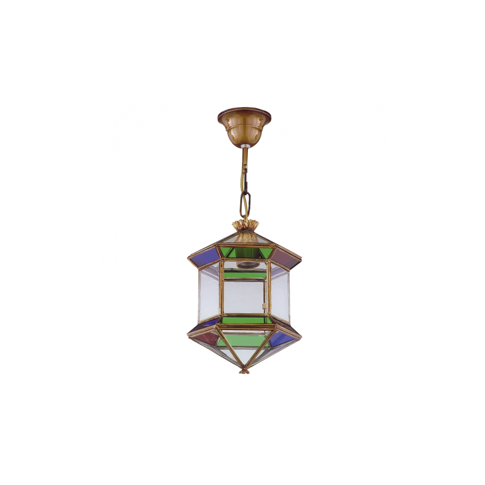 Farol de la serie GRANADINO con terminación en color BRONCE DORADO y combinación de cristales de colores. Está realizado en metal y cristal, decorado con cristales de colores. Su forma es geométrica, y sus dimensiones, con altura regulable, son de 35<,60x21x21 centímetros. Posee un portalámpara E27. Bombilla no incluida. Inspirado en el arte mudéjar. En esta misma serie podemos encontrar apliques faroles y plafones, tanto con combinaciones en opalina como con cristales de colores, y todos fiel al estilo de la serie.