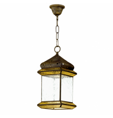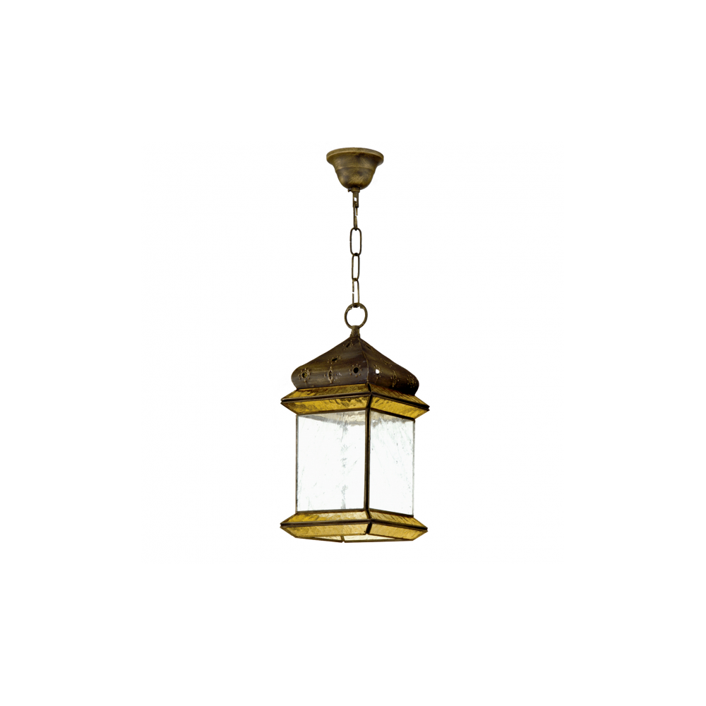 Colgante de 4 caras de la serie AMBARINA en color CUERO/AMBAR. Realizado en cristal y metal. Su diseño está inspirado en el arte califal. Sus dimensiones, regulables en altura, son de 50<,70x18x18 centímetros, teniendo el farol una altura de 39 centímetros y el portalámparas E27. Esta destinado para interiores o exteriores cubiertos. Destaca sus orificios en forma de estrella. Podemos encontrar en esta misma serie colgantes, apliques y plafones de distintos diseños pero fieles al estilo, pudiéndose crear la combinación perfecta en el hogar al que iluminen.