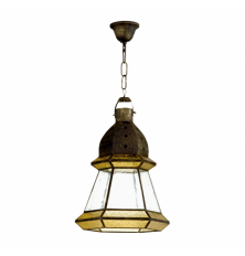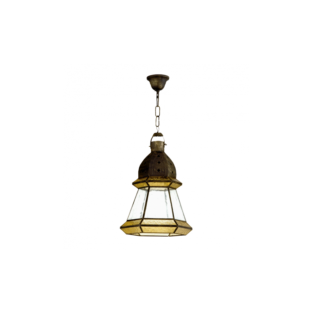 Colgante grande de la serie AMBARINA en color CUERO/AMBAR. Realizado en cristal y metal. Su diseño está inspirado en el arte califal. Sus dimensiones, regulable en altura, son de 60<,75x30x30 centímetros, teniendo el farol una altura de 45 centímetros y el portalámparas E27. Esta destinado para interiores o exteriores cubiertos. Destaca sus orificios en forma de estrella. Podemos encontrar en esta misma serie colgantes, apliques y plafones de distintos diseños pero fieles al estilo, pudiéndose crear la combinación perfecta en el hogar al que iluminen.