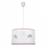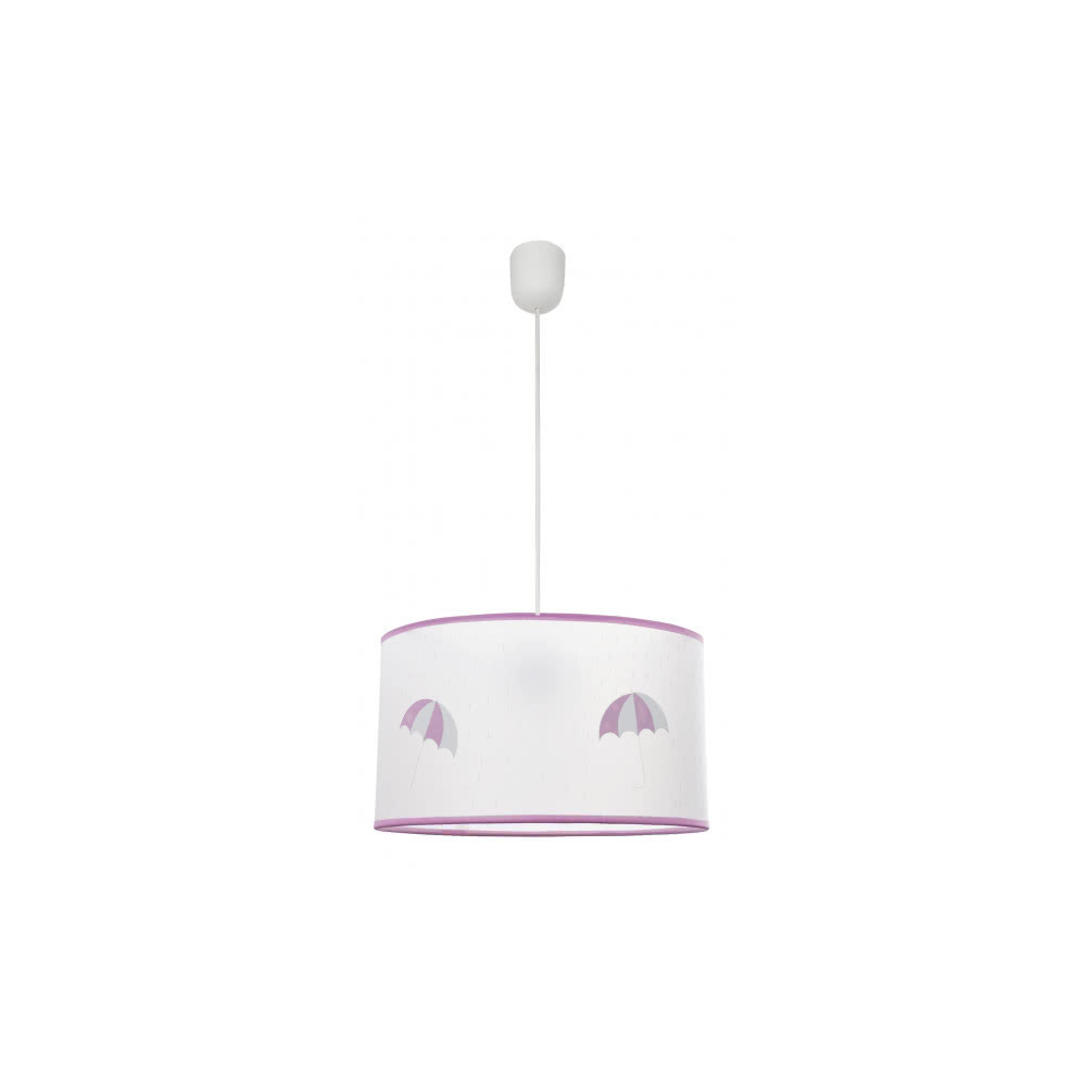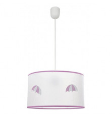 Colgante de la serie LLUVIA con portalámparas E27 y pantalla en textil color rosa. Su altura se puede regular entre 30 y 75 centímetros de altura y tiene un diámetro de 30 centímetros. Su peso neto es de 340 gramos.
