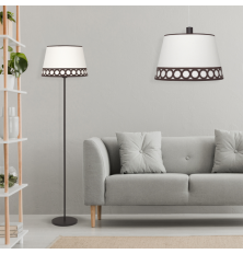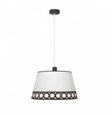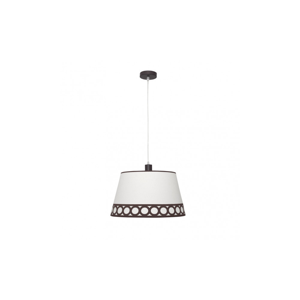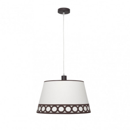 Colgante serie DALIA de color BEIS/MARRON. Está realizado en metal y material textil, con cenefa decorativa de motivos circulares. Posee un porta lámparas E27. Bombilla no incluida. Tiene unas dimensiones, regulable en altura, de 40<,90x40x40 centímetros. La familia se puede completar con el sobremesa, pie de salón y lámpara de tres y dos luces. Disponible todas las versiones en color blanco/plata, blanco/oro y beis/marrón.