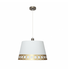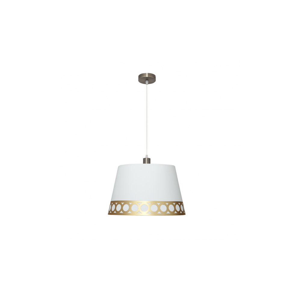 Colgante serie DALIA de color BLANCO/ORO. Está realizado en metal y material textil, con cenefa decorativa de motivos circulares. Posee un porta lámparas E27. Bombilla no incluida. Tiene unas dimensiones, regulable en altura, de 40<,90x40x40 centímetros. La familia se puede completar con el sobremesa, pie de salón y lámpara de tres y dos luces. Disponible todas las versiones en color blanco/plata, blanco/oro y beis/marrón.