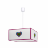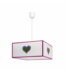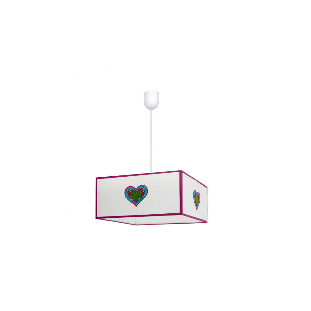 Colgante infantil serie Amor de color blanco/rosa. Realizado en material textil, destaca por su forma cuadrada y el motivo bordado en forma de corazón. Sus dimensiones son 35x35 cm, la altura de la pantalla son 16 cm y su altura total regulable. Portalámparas E27. Puede completar la serie con el sobremesa del mismo color.