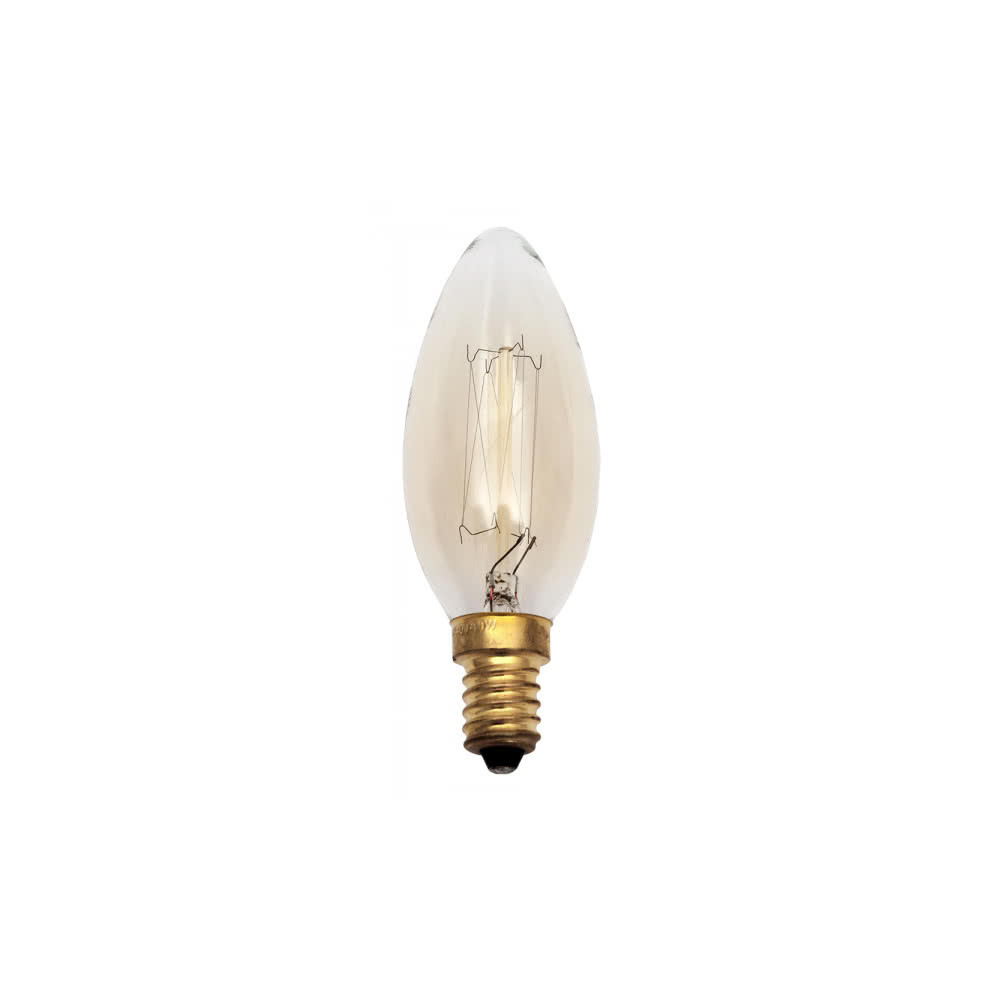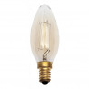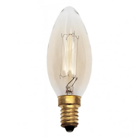 Bombilla de incandescencia modelo vintage vela de color ámbar. Posee una potencia de 25W y un color de luz cálido de 3000ºk. El porta lámparas es E14. Realizada en cristal y metal. Es ideal para lámparas decorativas con diseño vintage.