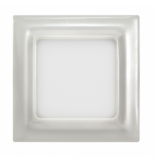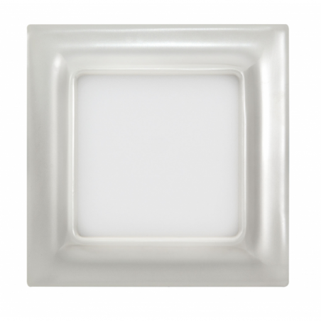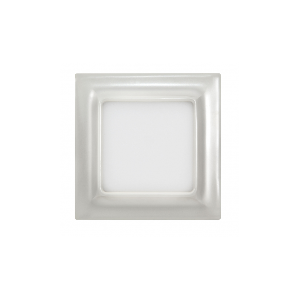 Downlight modelo VENTURA en color perla plata. Tiene una potencia de luz de 9 watios, 720 lúmenes y 4000K. Su medida es de 12X12X1,5 centímetros y la de corte es 10,5x10,5 centímetros. Peso neto, 225 gramos.