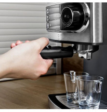 EL MEJOR CAFÉ PARA TU DÍA A DÍA Power Espresso 20 llega a tu cocina para preparar todo tipo de cafés con solo apretar un botón. Disfruta de espressos y capuccinos con el máximo aroma. GRAN POTENCIA Y PRESIÓN, AROMA INTENSO El secreto de la crema y el aroma está en la presión. Con su gran bomba de presión de 20 bares y sus 850 W de potencia, conseguirás la mejor crema y el máximo aroma para disfrutar del café perfecto. VAPORIZADOR ORIENTABLE Aprovecha el vaporizador orientable de la Power Espresso 20 con protección para el uso para espumar leche, emitir agua para infusiones, calentar líquidos y preparar los mejores capuccinos. BRAZO CON DOBLE SALIDA Y DOS PORTAFILTROS Prepara uno o dos cafés a la vez gracias a su brazo con doble salida y sus dos portafiltros con capacidad para una o dos tazas. BANDEJA QUE CALIENTA LAS TAZAS Gracias a su bandeja, no solo podrás almacenar tus tazas, sino que también podrás calentarlas previamente para evitar el contraste térmico entre el café y el vaso y así disfrutar de todo el aroma y la intensidad. INDICADORES LUMINOSOS La cafetera es increíblemente fácil de usar, selecciona la función que desees, se encenderá un indicador luminoso y tu café estará listo en unos instantes. INCLUYE CUCHARA MEDIDORA La cafetera incluye una cuchara dosificadora que te servirá también para prensar el café consiguiendo un aroma más intenso. MUY FÁCIL DE LIMPIAR Dispone de un gran depósito de 1,5 l y una bandeja de goteo extraíble que te harán la vida más fácil. Además, es apto para el lavavajillas, por lo que podrás disfrutar de una cómoda limpieza.