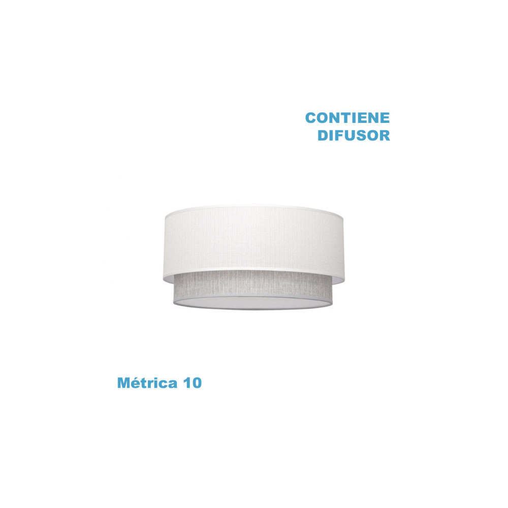 Pantalla de la serie KENYA en color BLANCO/GRIS. Realizada en material textil. Formada por dos pantallas de distinto color y textura, con DIFUSOR INCLUIDO. Diseñada para cogida con METRICA 10. Tiene unas dimensiones de 50x48x23 centímetros. Disponibles en esta serie pantallas de 14, 18, 40 y 50 centímetros de diámetro, tanto en la combinación gris/blanco como en blanco/gris.