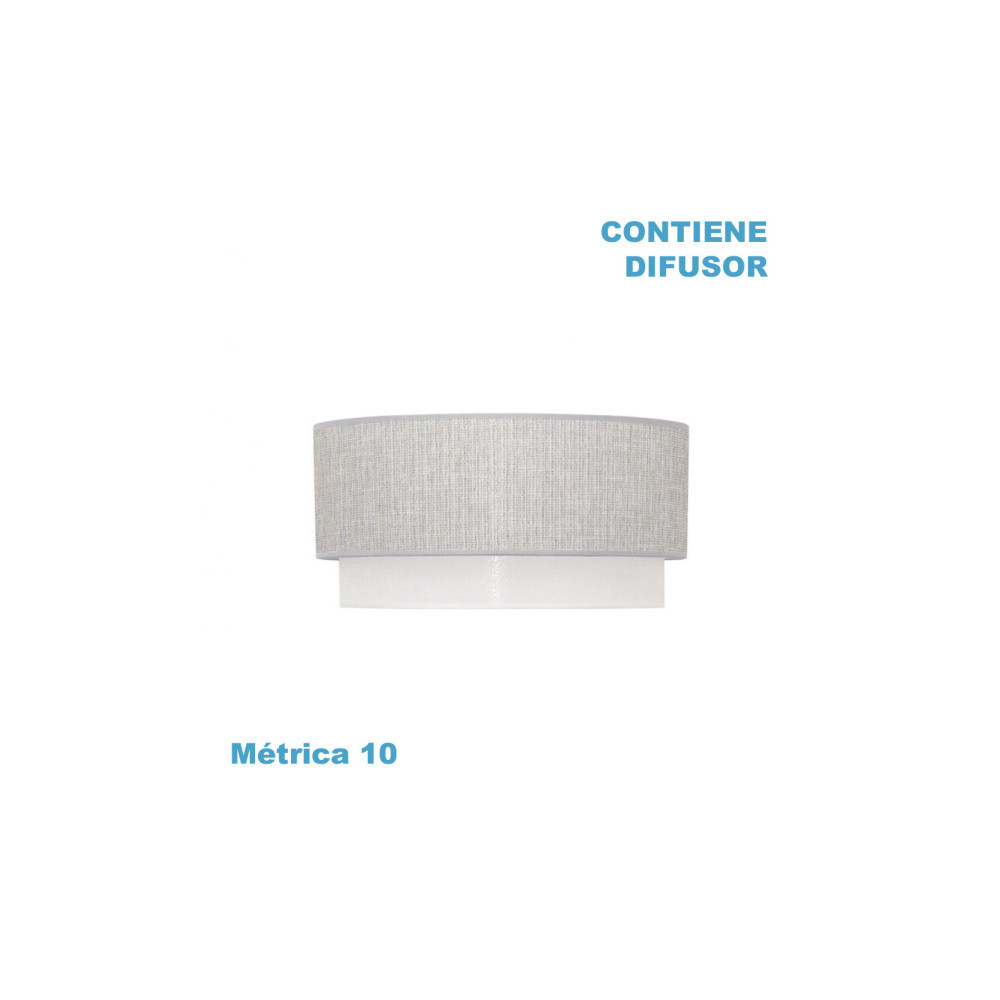 Pantalla de la serie KENYA en color GRIS/BLANCO. Realizada en material textil. Formada por dos pantallas de distinto color y textura, con DIFUSOR INCLUIDO. Diseñada para cogida con METRICA 10. Tiene unas dimensiones de 50x48x23 centímetros. Disponibles en esta serie pantallas de 14, 18, 40 y 50 centímetros de diámetro, tanto en la combinación gris/blanco como en blanco/gris.
