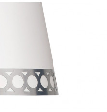 Pantalla cónica abierta de la serie DALIA de color BLANCO/PLATA. Diseñada para cogida a un portalámparas E14. Está realizado en metal y material textil, con cenefa decorativa de motivos circulares, ideal para lámparas y decorar en dormitorios, salas de estar, salones y comedores. Tiene unas dimensiones de 15x12x13 centímetros. En esta serie encontramos las pantallas de 40, 25 y 15 centímetros de diámetro, y combinadas en blanco/oro, en blanco/plata ó en beis/marrón.
