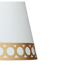 Pantalla cónica abierta de la serie DALIA de color BLANCO/ORO. Diseñada para cogida a un portalámparas E14. Está realizado en metal y material textil, con cenefa decorativa de motivos circulares, ideal para lámparas y decorar en dormitorios, salas de estar, salones y comedores. Tiene unas dimensiones de 15x12x13 centímetros. En esta serie encontramos las pantallas de 40, 25 y 15 centímetros de diámetro, y combinadas en blanco/oro, en blanco/plata ó en beis/marrón.