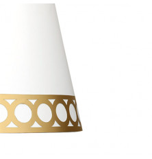 Pantalla cónica abierta de la serie DALIA de color BLANCO/ORO. Diseñada para cogida a un portalámparas E14. Está realizado en metal y material textil, con cenefa decorativa de motivos circulares, ideal para sobremesas y decorar en dormitorios, salas de estar, salones y comedores. Tiene unas dimensiones de 25x20x15 centímetros. En esta serie encontramos las pantallas de 40, 25 y 15 centímetros de diámetro, y combinadas en blanco/oro, en blanco/plata ó en beis/marrón.