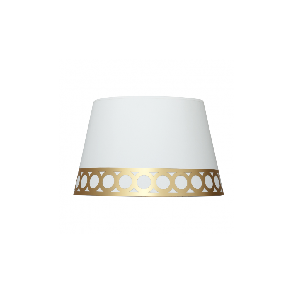 Pantalla cónica abierta de la serie DALIA de color BLANCO/ORO. Diseñada para cogida a un portalámparas E27. Está realizado en metal y material textil, con cenefa decorativa de motivos circulares, ideal para colgantes y decorar en dormitorios, salas de estar, salones y comedores. Tiene unas dimensiones de 40x30x25 centímetros. En esta serie encontramos las pantallas de 40, 25 y 15 centímetros de diámetro, y combinadas en blanco/oro, en blanco/plata ó en beis/marrón.