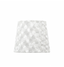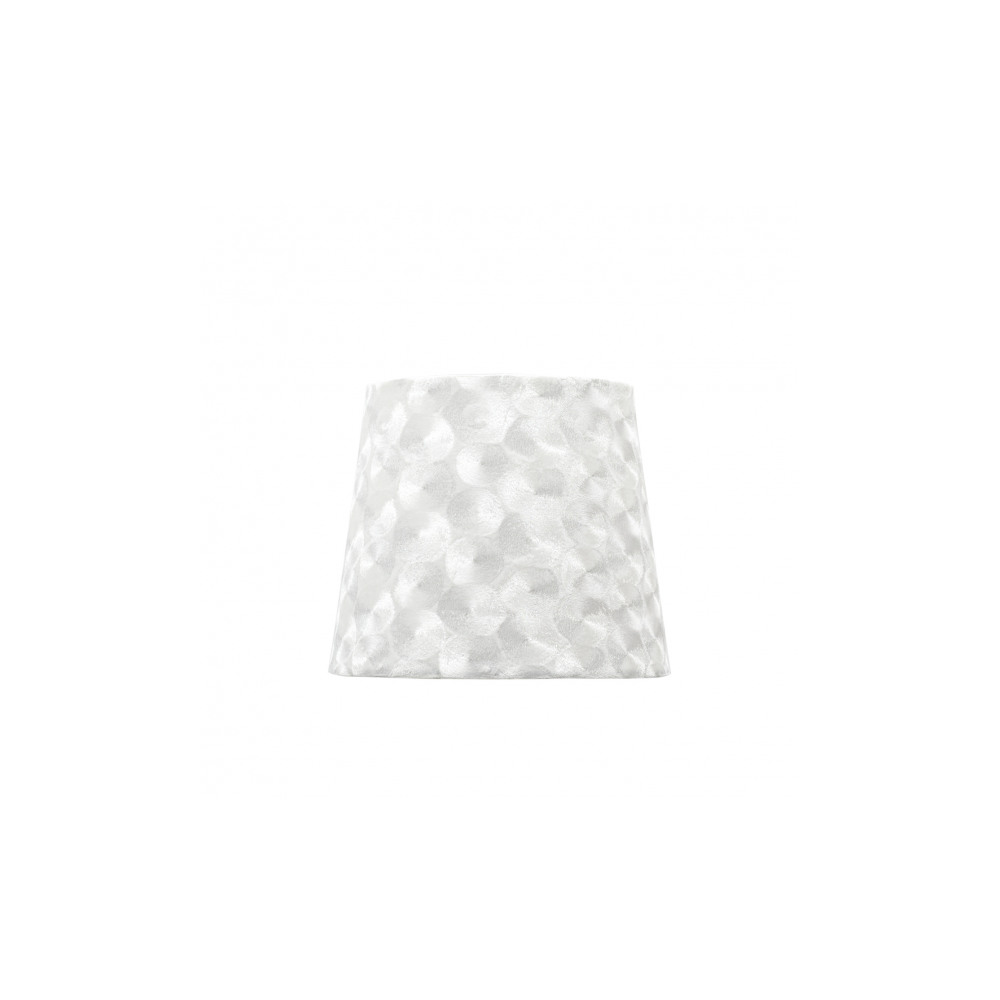 Pantalla serie Fátima de color blanco. Realizada en material textil, de textura suave y con efecto nacarado. Su agarre es de pinza. Su medida es 15dx8dx12h cm y está disponible en varios tamaños.