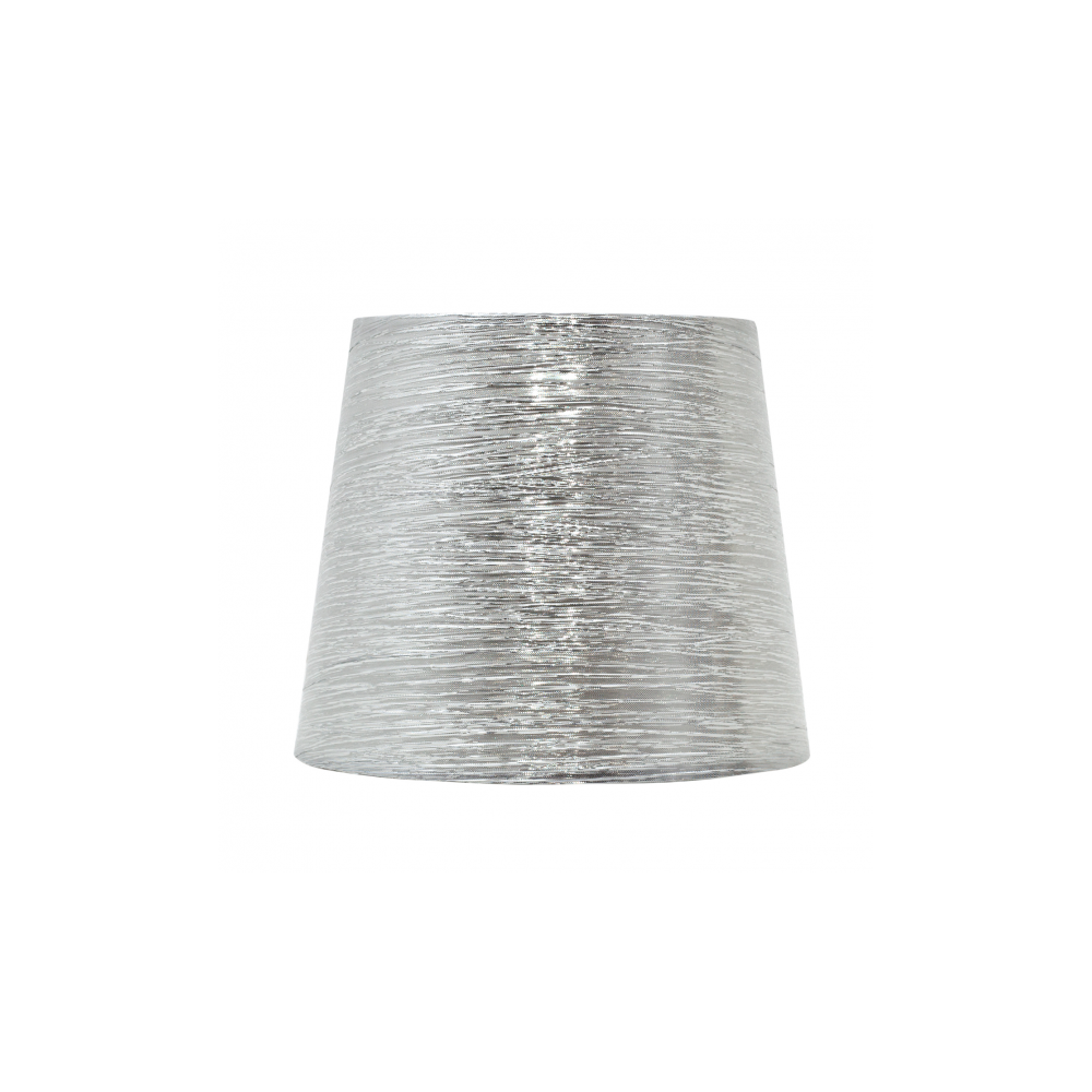 Pantalla serie Nova de color plata brillo. Se caracteriza por una decoración de hilos plateados que crean un juego de brillos y luces muy especial. Sus dimensiones son 40dx20dx28h. La puede encontrar también en los formatos de 45,35, 30, 25, 20 y 15 cm y combinar con un armazón en color cromo o níquel.
