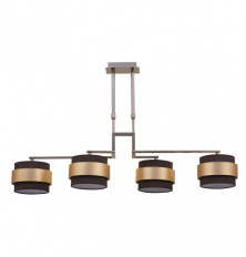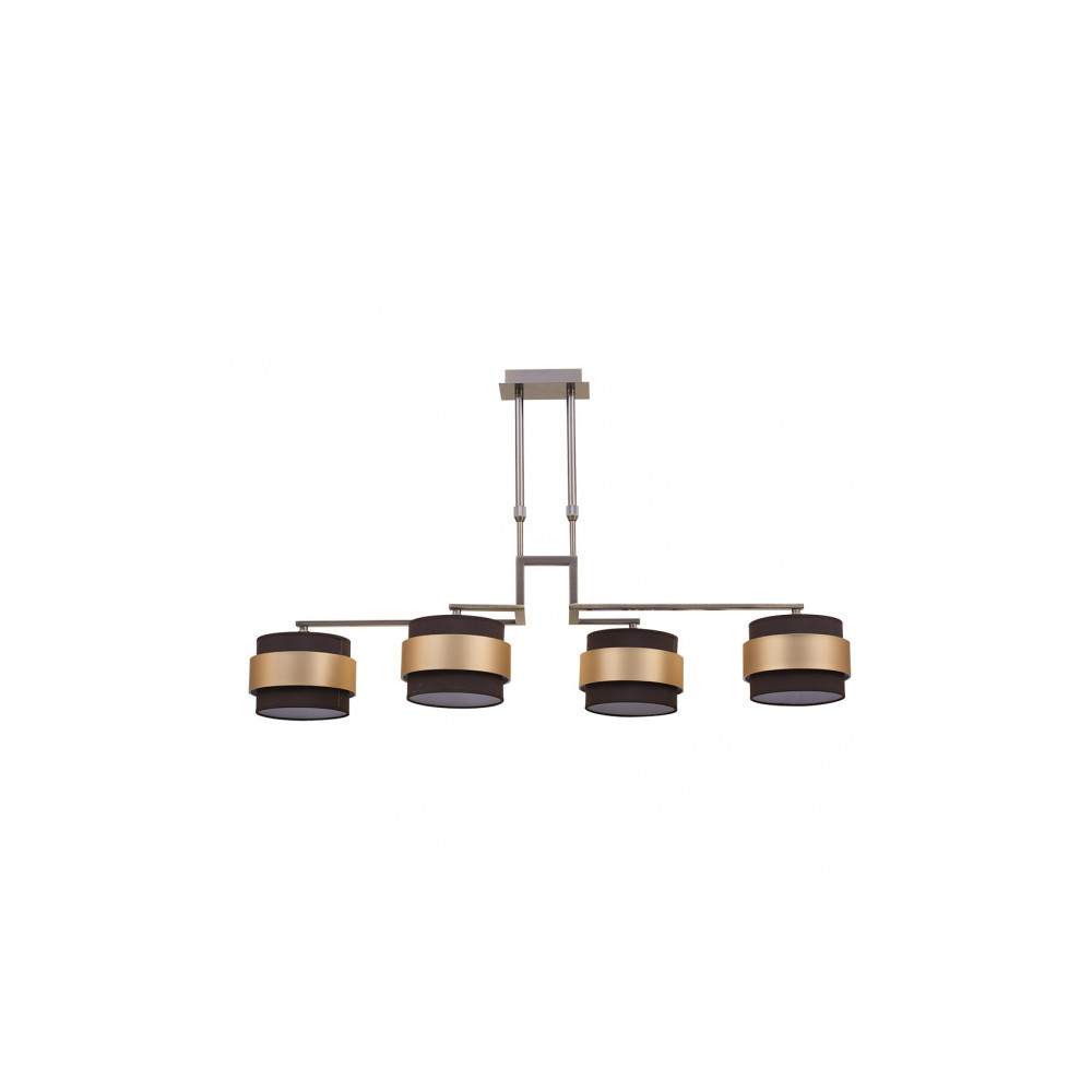 Lámpara de cuatro luces de la serie BREMEN en color CUERO y pantallas MARRON/ORO. Realizada en metal y textil, destaca por sus pantallas dispuestas en línea, de esta misma serie puede encontrar la lámpara de cuatro luces con sus pantallas dispuestas hasta de cuatro formas diferentes, para elegir la que más le guste y se adapte a la decoración de la estancia que ilumina. Posee cuatro portalámparas E14. Bombillas no incluidas. Sus dimensiones, regulables en altura, son 50<,65x92x25 centímetros. Puede completar la serie con la lámpara de tres luces, los colgantes de 50 cm y 40 cm de diámetro y el sobremesa, todas las versiones tanto en cromo/blanco-plata como en cuero/marrón-oro. Está destinado exclusivamente para interiores y su instalación es en superficie.