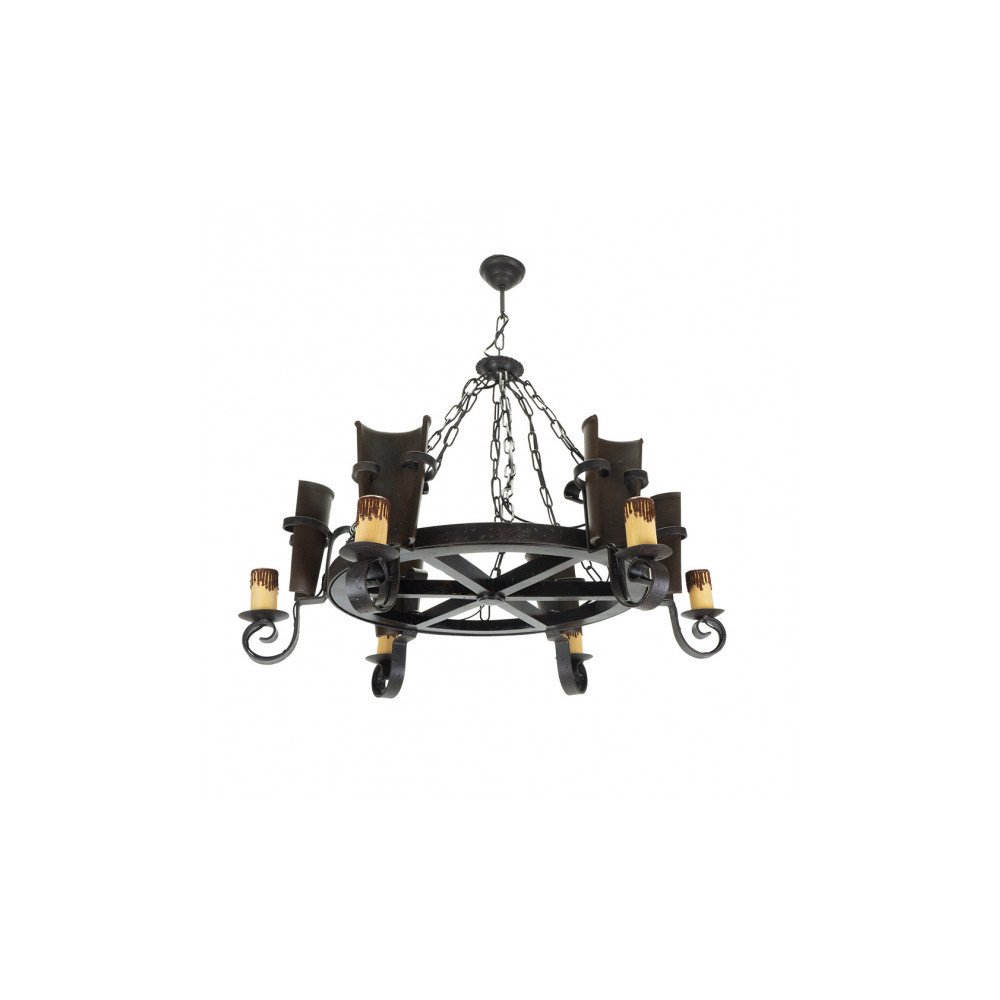 Lámpara de seis luces de la serie CANTINA en color MARRON RUSTICO. Realizado en metal, tejas y rueda de resina, con portavelas de policarbonato. Presenta un estilo rústico ideal para casas de campo y bodegones. Utiliza seis portalámparas E27. Bombillas no incluidas. Se recomienda bombillas Led en forma de vela para preservar la estética del diseño de la lámpara y conseguir un mayor ahorro en el consumo. Tiene unas dimensiones, regulables en altura, de 40<,75x83x83 centímetros. En esta serie podemos encontrar lámparas de tres, cinco y seis luces y los apliques de una y dos luces.