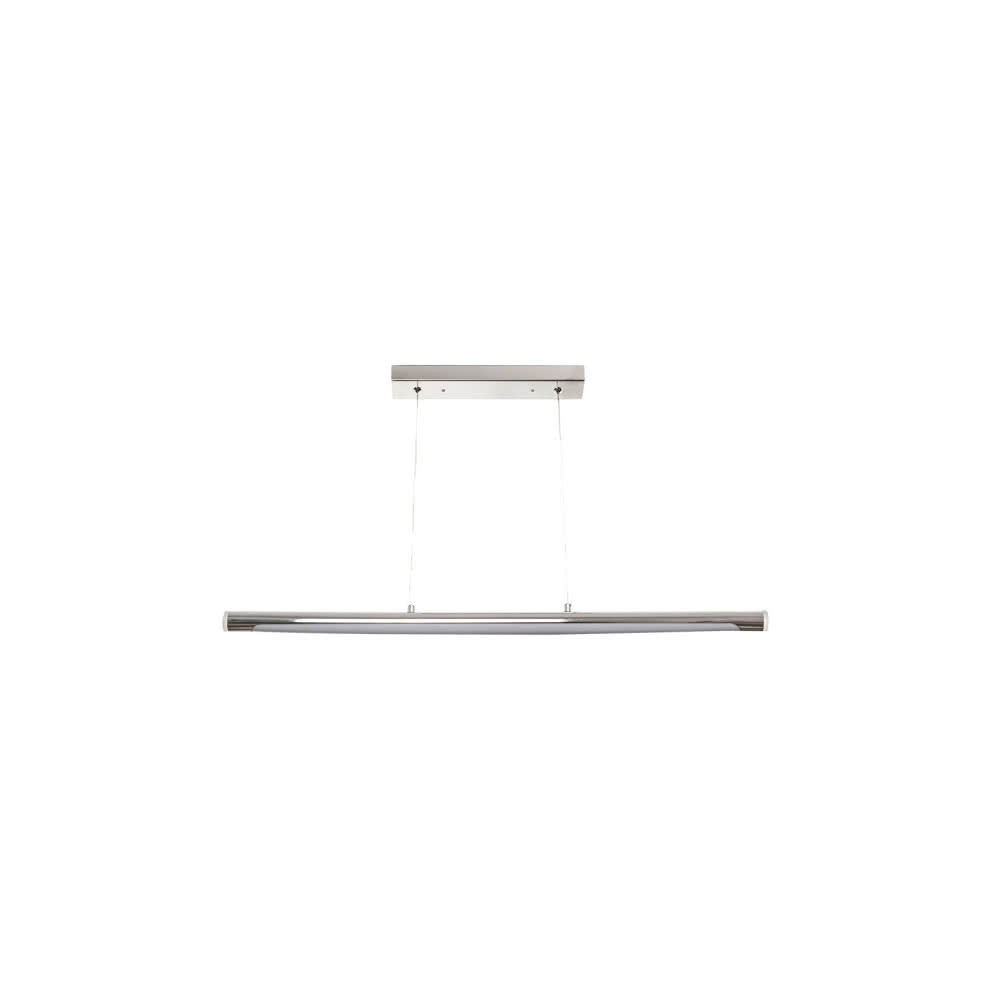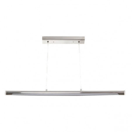 Colgante con tecnología LED integrada de la serie GIZA, realizado en metal cromado. Su base rectangular para sujetar al techo tiene una medida de 30x5x3 centímetros. Su altura es regulable entre 10 y 105 centímetros, y la medida del tubo es de 71x3 centímetros. Su potencia de luz es de 16 watios, 1280 lúmenes y 4000K. Y tiene un peso neto de 810 gramos.