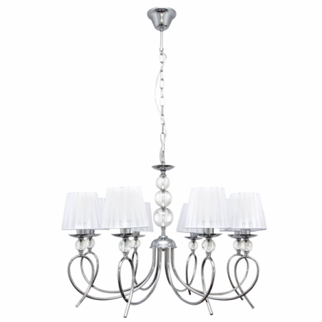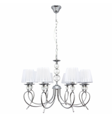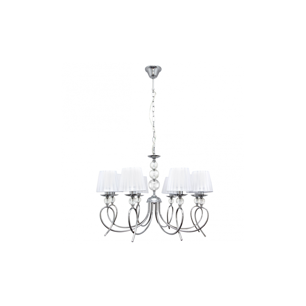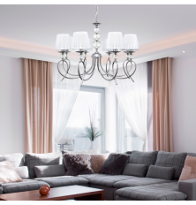 Lámpara serie RIN de ocho luces en color cromo con pantalla blanca. Realizado en metal y textil, con adorno en cristal transparente. Utiliza ocho porta lámparas E14. Se recomienda bombillas de tecnología LED para un mayor ahorro y eficiencia con un tono de luz blanco natural que realce el color de la lámpara. Sus medidas son 80x60 cm de diámetro. Puede combinarse con el sobremesa, aplique y pie de salón de color cromo.