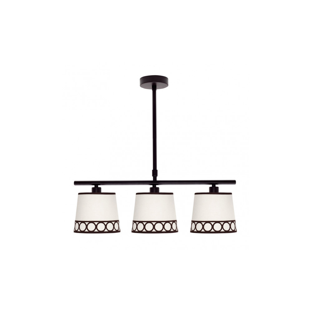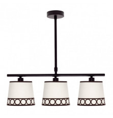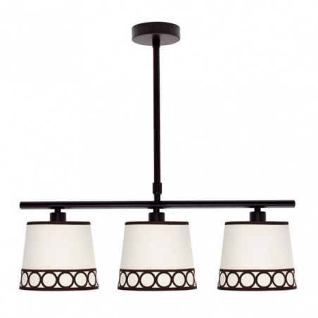 Lámpara de tres luces de la serie DALIA de color BEIS/MARRON. Está realizado en metal y material textil, con cenefa decorativa de motivos circulares. Posee tres porta lámparas E14. Bombillas no incluidas. Tiene unas dimensiones, regulable en altura, de 53<,80x56x16 centímetros. La familia se puede completar con el sobremesa, pie de salón, colgante y lámpara de dos luces. Disponible todas las versiones en color blanco/plata, blanco/oro y beis/marrón