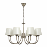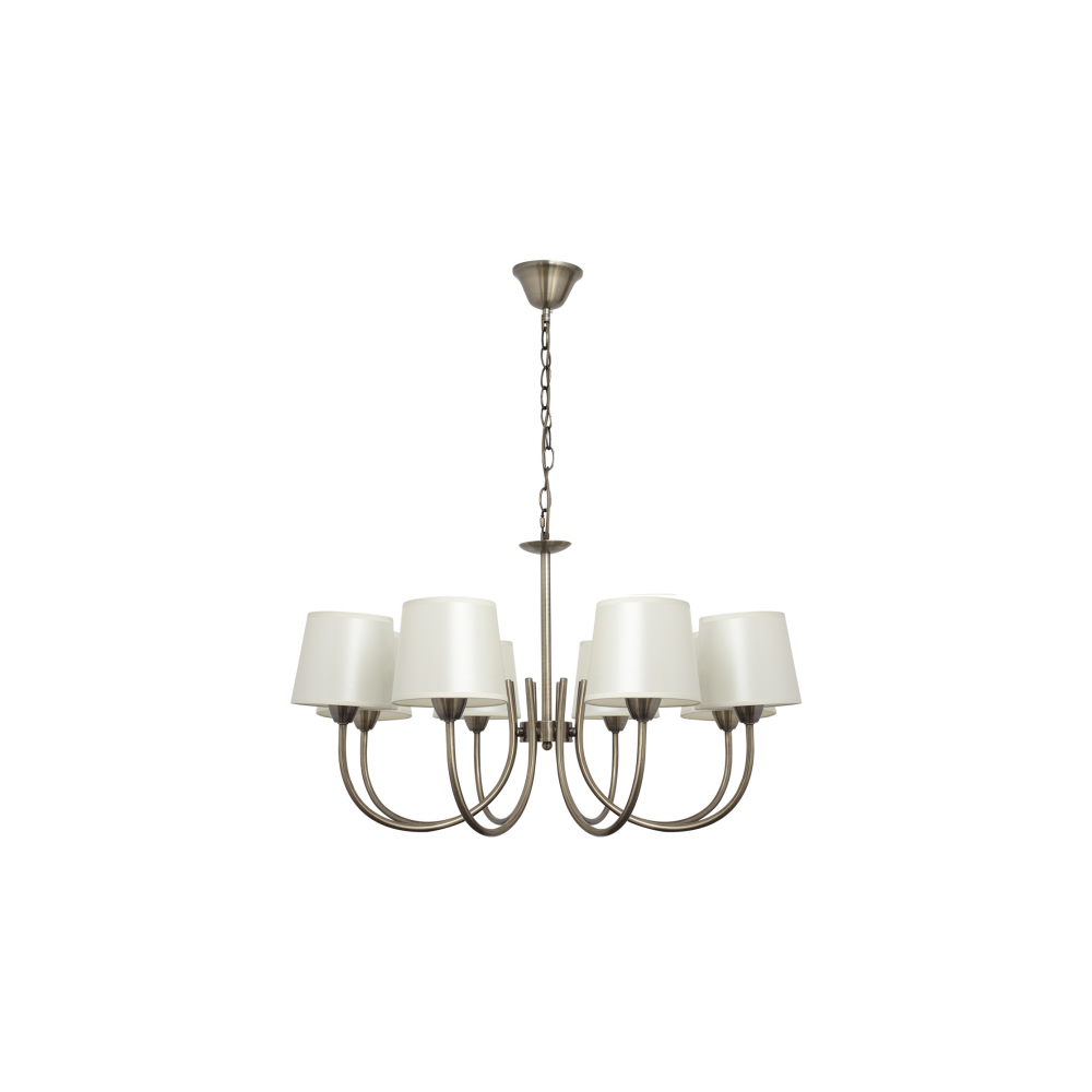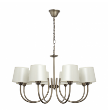 Lámpara serie Guadalajara de color cuero/beis. Está realizada en metal y textil. Está disponible también el sobremesa, aplique, lámpara de cinco luces y tres luces en color cromo, cuero y blanco. Sus dimensiones son 62<,92x72x72 cm con altura regulable. Su peso neto es de 2640 g. Posee ocho portalámparas E14.