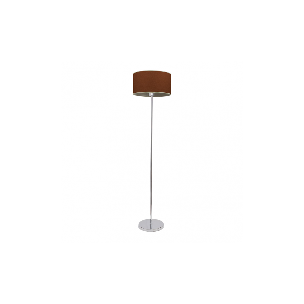 pie salón de estilo moderno con pantalla de 40 centímetros de diámetro, tela color caldera y portalampara E27, armazon de color cromo con base cuadrada y cable de conexión transparente. el peso del pie de salón es de 3370 gramos y sus medidas son 150x40x40.