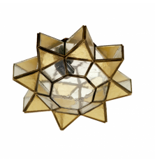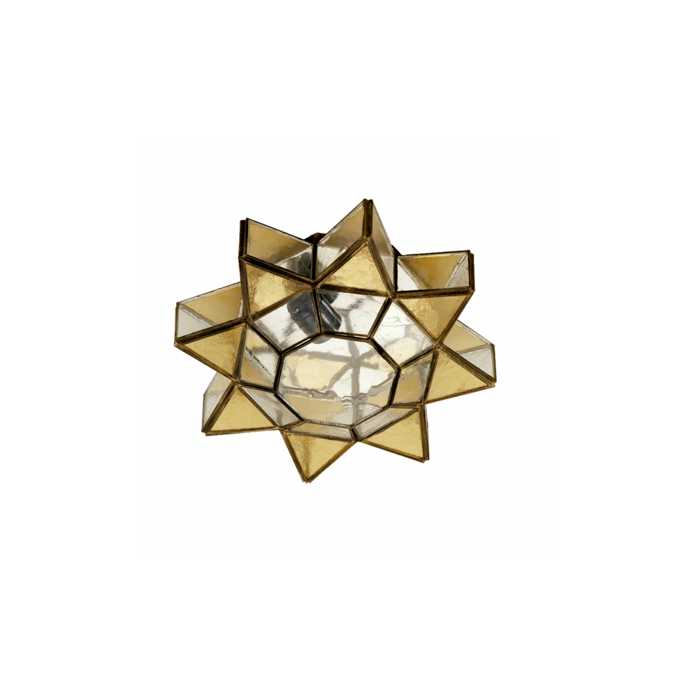 Plafón o Aplique estrella de la serie AMBARINA de color CUERO/AMBAR. Realizado en cristal y metal, con el fondo en terminación de espejo. Su diseño está inspirado en el arte califal. Sus dimensiones son 12x35x35 centímetros y el portalámparas E27. Esta destinado para interiores o exteriores cubiertos. Destaca su forma de estrella tan presente en el arte árabe de esta época califal, y que podemos colocar tanto como plafón o como aplique. Podemos encontrar en esta misma serie colgantes, apliques y plafones de distintos diseños pero fieles al estilo, pudiéndose crear la combinación perfecta en el hogar al que iluminen.