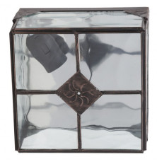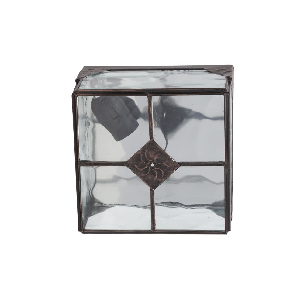 Plafón Pequeño de la serie ESTEPA fabricado en metal color cobre envejecido y cristal rugoso. Tiene unas dimensiones de 11x20x20 centímetros y un peso neto de 1200 gramos. Posee un porta lámparas E27, bombilla no incluida. En esta serie podemos encontrar el colgante, el aplique y dos tamaños de plafones, todos en color plata, oro y cobre.
