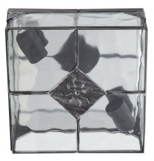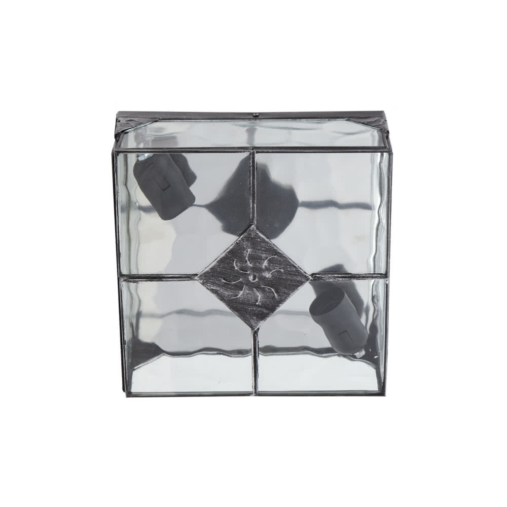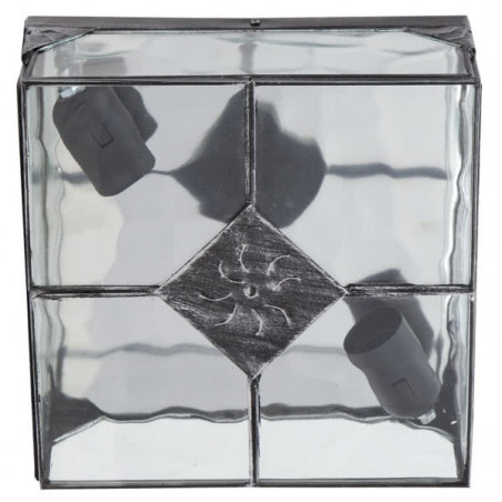 Plafón Grande de la serie ESTEPA fabricado en metal color plata envejecida y cristal rugoso. Tiene unas dimensiones de 11x25x25 centímetros y un peso neto de 1770 gramos. Posee dos porta lámparas E27, bombillas no incluidas. En esta serie podemos encontrar el colgante, el aplique y dos tamaños de plafones, todos en color plata, oro y cobre.