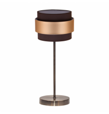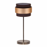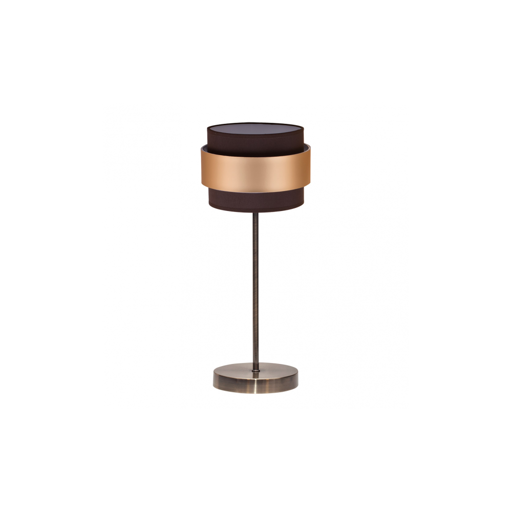 Sobremesa de la serie BREMEN en color CUERO y pantalla MARRON/ORO. Posee un portalámparas E14. Bombilla no incluida. Sus dimensiones son de 39x16x16 centímetros. Está realizado en material textil y metal. Puede completar la serie con la lámpara de tres y cuatro luces y los colgantes de 40 cm y de 50 cm de diámetro, todas las versiones con pantallas en blanco/plata o en marrón/oro.
