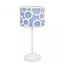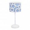 Sobremesa serie ORLANDO en color BLANCO/AZUL. Posee un portalámparas E14. Bombilla no incluida. Está realizado en metal y textil de color azul. Se caracteriza por una pantalla calada con motivos geométricos circulares en metal. Sus medidas son 42x18x18 centímetros. Puede combinarlo con el colgante de la misma familia y en colore rosa, lila, marrón y azul.