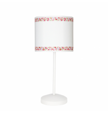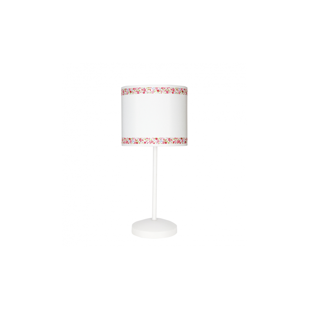 Sobremesa serie CENEFA de color blanco con detalles en rosa. La pantalla es de 17 cm de diámetro con dos cenefas decorativas en tonos rosas y verdes. El portalámparas es E14.