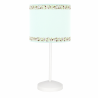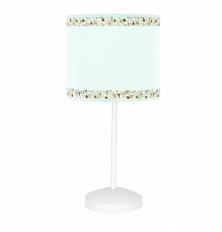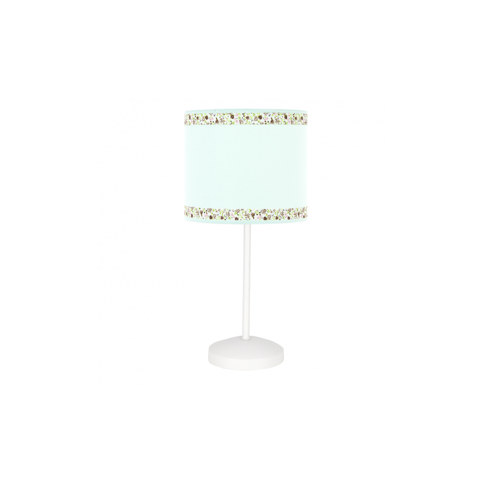 Sobremesa serie CENEFA de color verde agua. La pantalla es de 17 cm de diámetro con dos cenefas decorativas en tonos verdes, marrones y rosas. El portalámparas es E14.