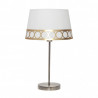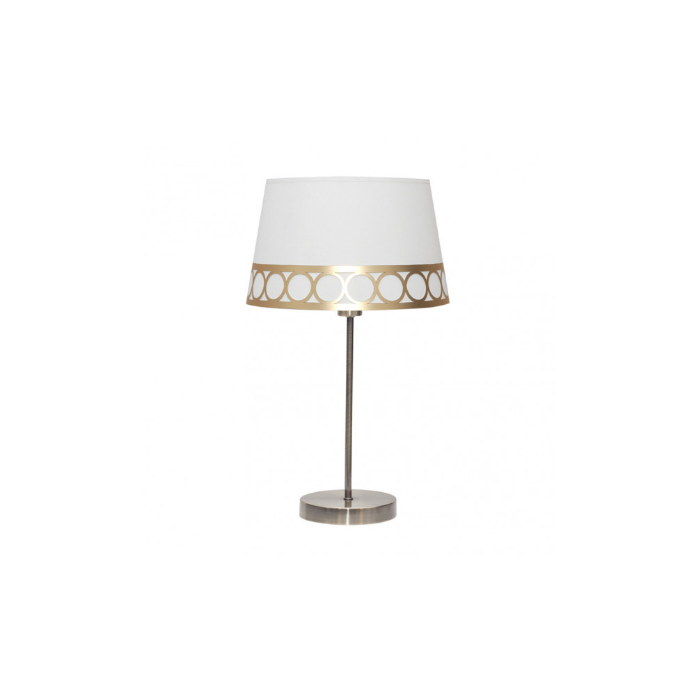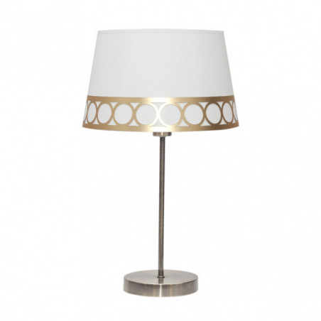 Sobremesa de la serie DALIA de color BLANCO/ORO. Está realizado en metal y material textil, con cenefa decorativa de motivos circulares. Posee un porta lámparas E14. Bombilla no incluida. Tiene unas dimensiones de 44x25x25 centímetros. La familia se puede completar con el sobremesa, pie de salón y lámpara de tres y dos luces. Disponible todas las versiones en color blanco/plata, blanco/oro y beis/marrón.